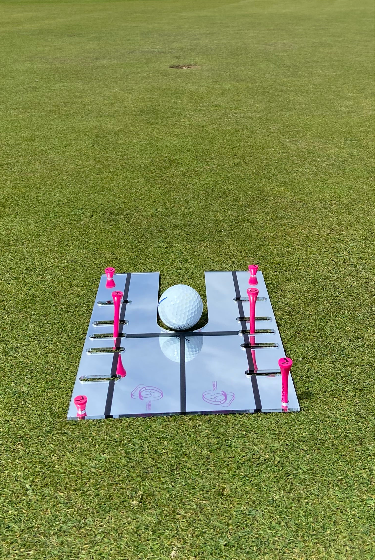 elongated rails allow for the placement of golf tees, enabling versatile and customized